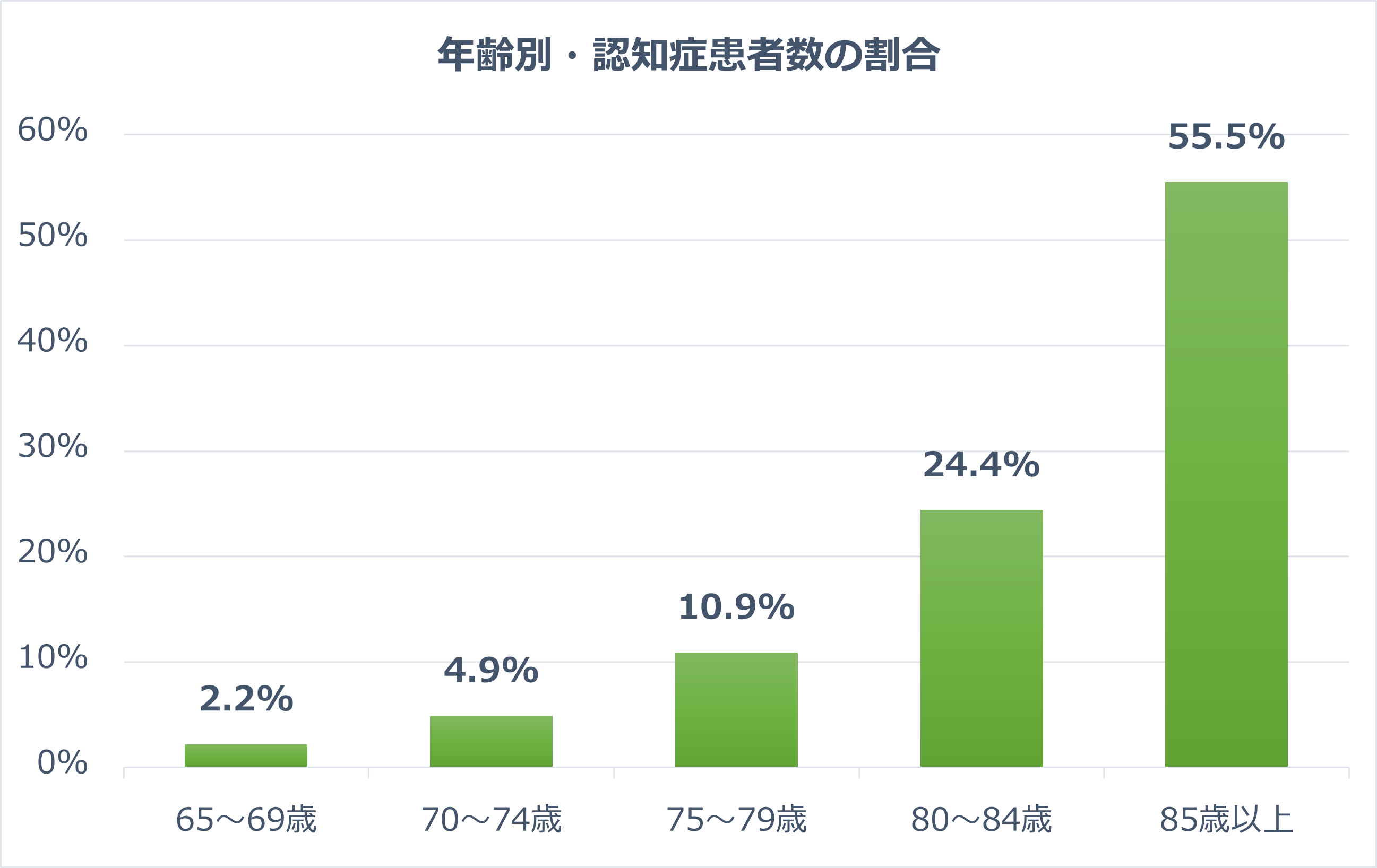 日本における65歳以上の認知症患者数は約600万人(2020年時点)といわれています。認知症の割合は年齢を重ねるとともに高まるとされ、85歳以上では55%以上に昇ります。